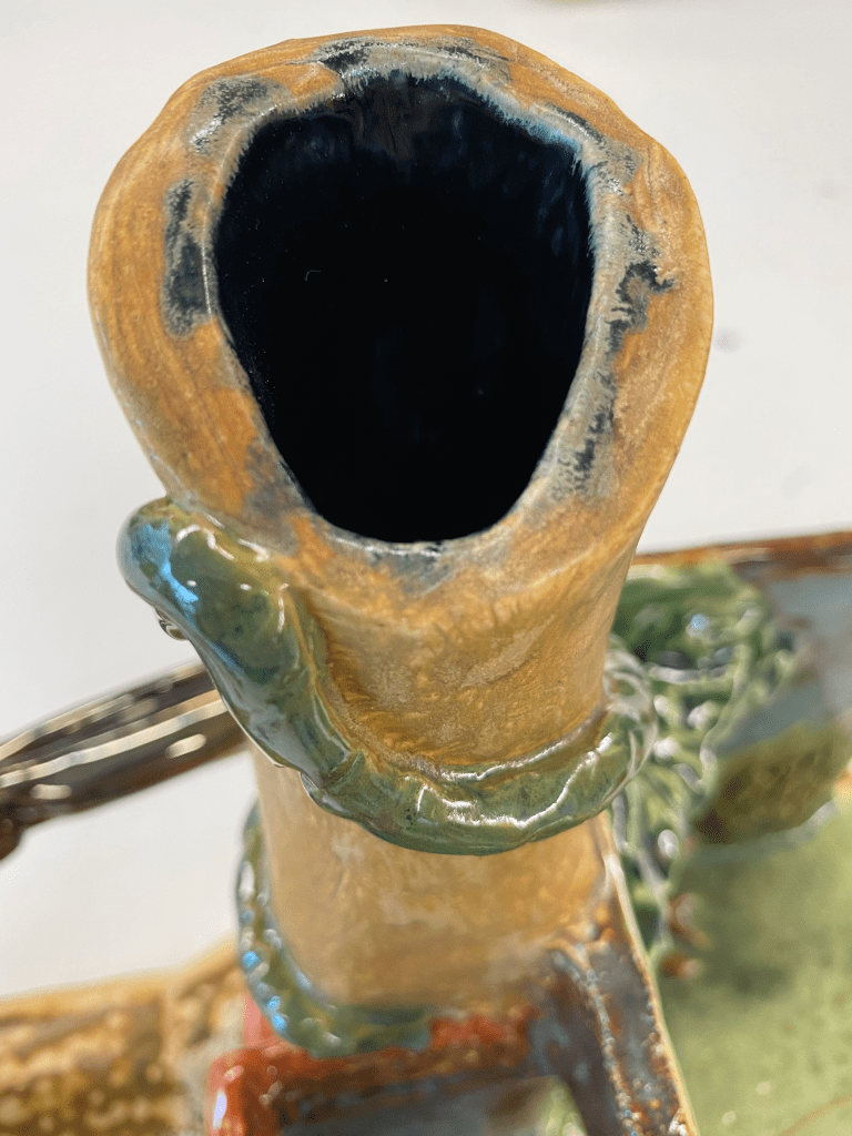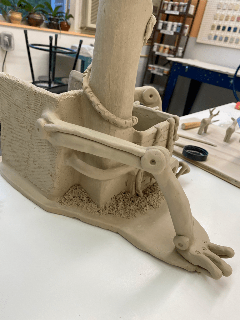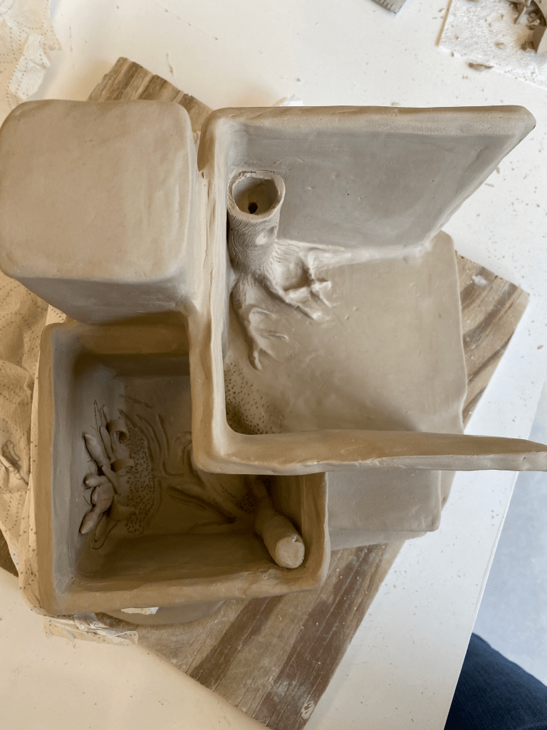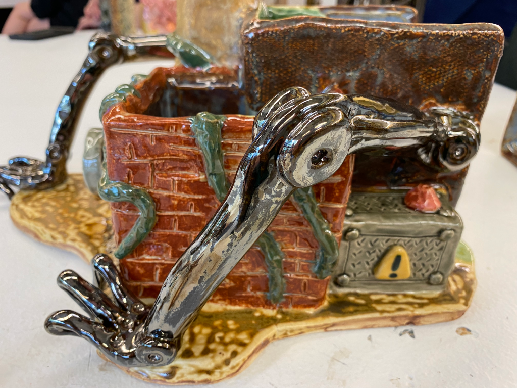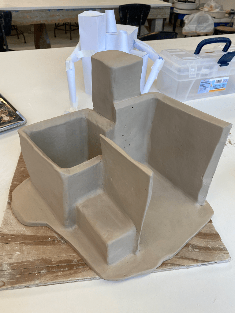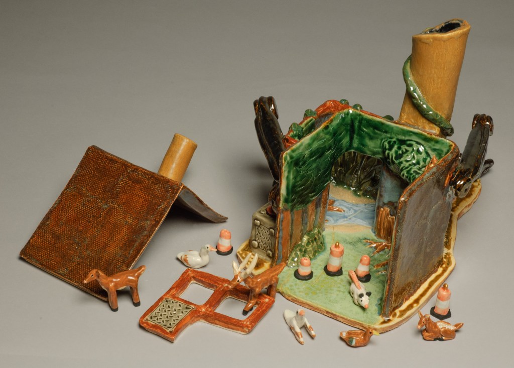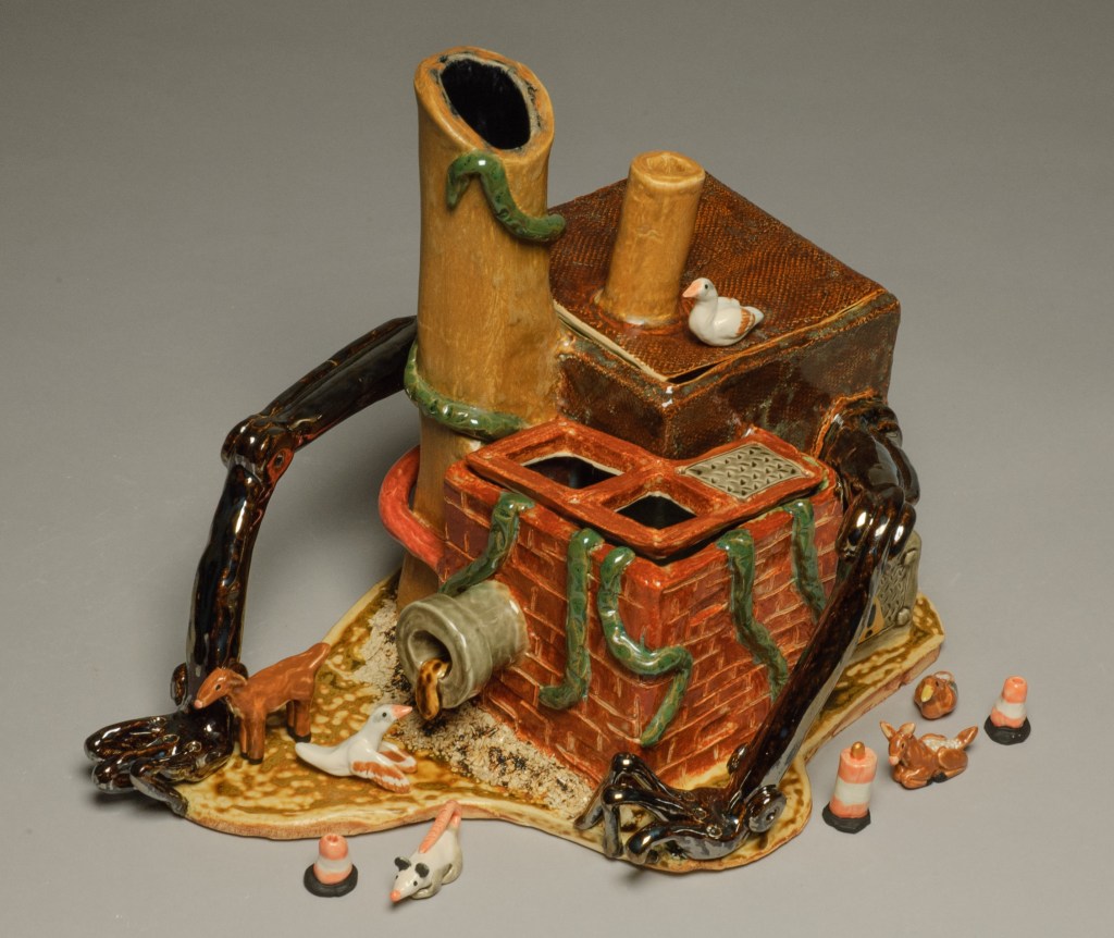 Because this project focused on slab construction, I found it easiest to make a series of rectangular boxes. Here, you can see some of the walls marked off with their measurements (I actually had a lot of fun with this)All of the walls are put in place. Each wall has beveled edges to allow it to interlock with other slabs nicely. There are two main “rooms” inside. The to-scale paper model I created is in the backgroundI added the main features of the interior: a large tree in the main room, and a pond (also with a tree) in the smaller roomNow the exterior gets its details: the chimney is formed into a cylindrical shape, the sewage pipe is added, as are long vines, and both buildings get textured The arms are added. Why have arms? Well, human innovation is constantly moving forward. We continue to create bigger and more advanced things. But, this comes with a price: it’s taxing to nature. We often take too much without giving back. That’s what this piece discussesNow that it’s been bisque fired, the piece is ready for glazing. All of these colors are going to change radically after the final firingThe outside is glazed, too. Glazing this piece took quite a whileHere are the miniatures I made for the diorama scene. It includes: two traffic barrels, four traffic cones, three piles of trash, three lily pads, a duck and two chicks, an opossum, an owl, two geese, and a deer family