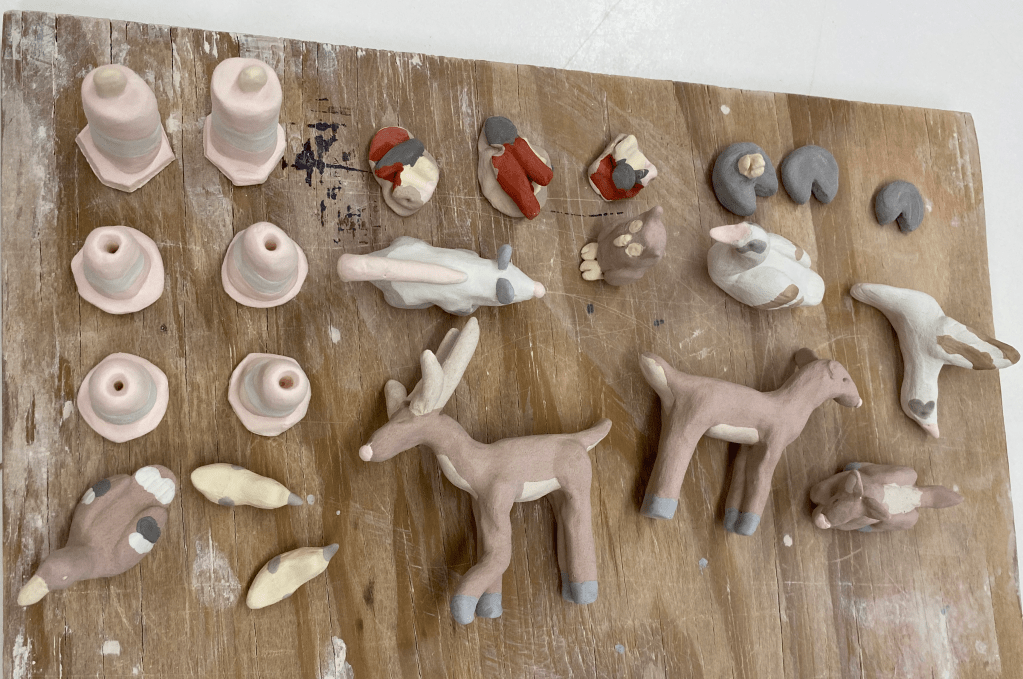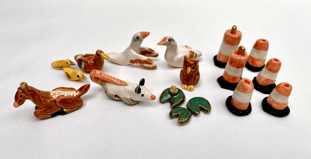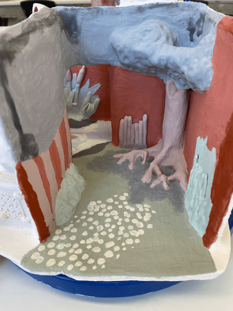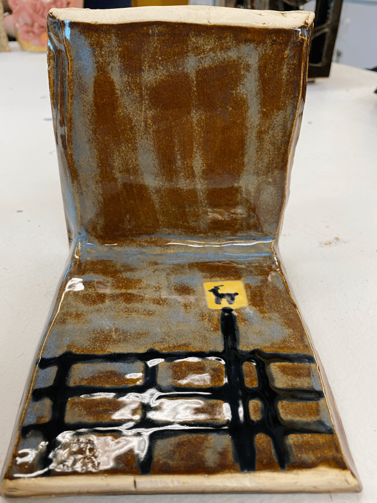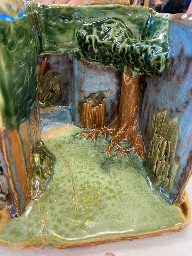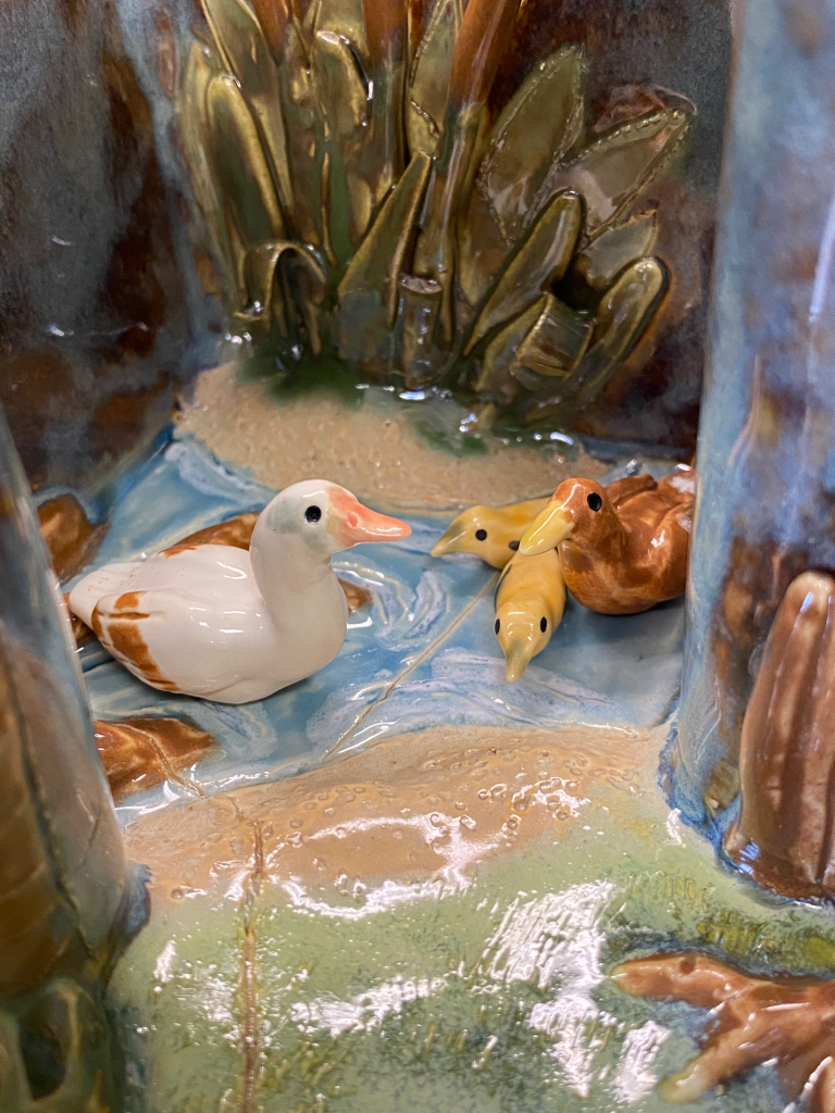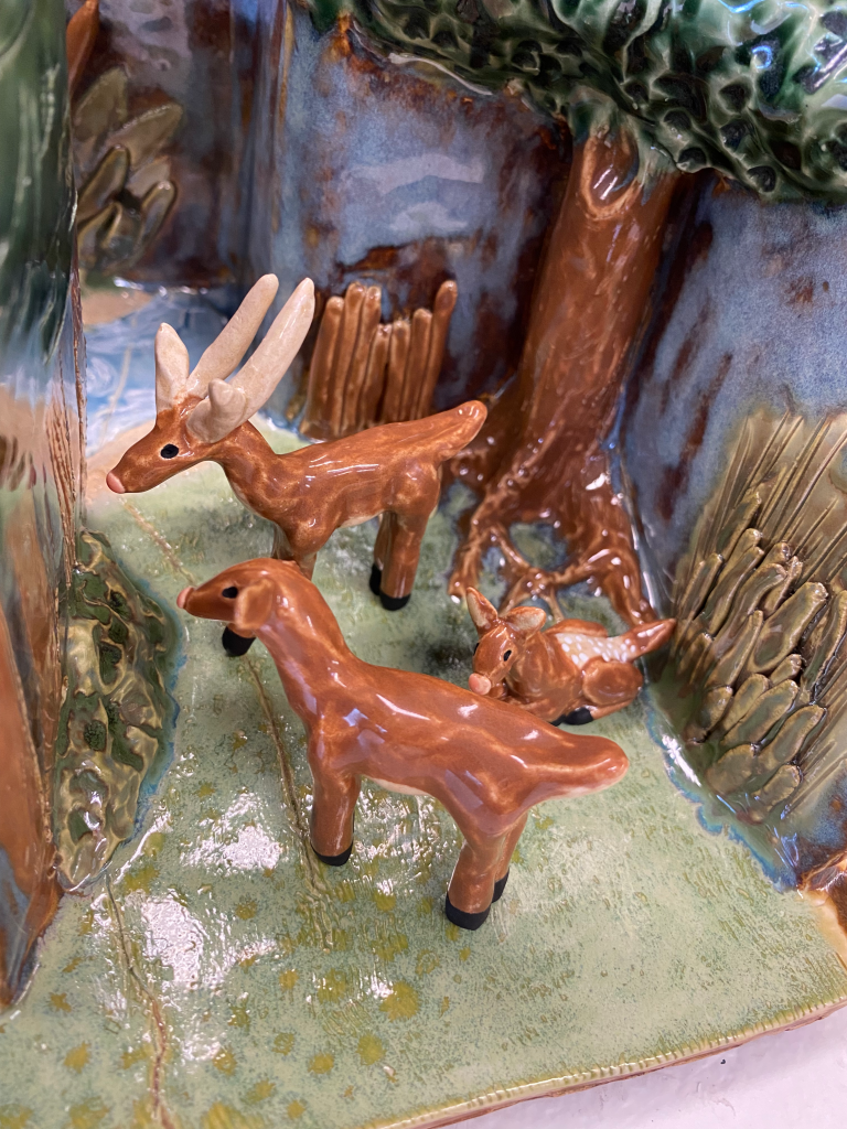 These two pictures my professor took are perfectly modeled to show how the minis can be moved around the “set”My professor also managed to get the colors to pop!Here is the interior of the main room with grass, the large tree, some trees in the background on the left wall, and some bushes/reedsThis is the pond with its smaller tree and a bunch of cattails. Notice how the color of the sky went from bright red to blue-brown (the magic of glaze!)One of my favorite details. On the back of the “lid” to the main room, I added a fence with a deer crossing sign. Despite the nature being so pristine in those two rooms, there is still something that confines it. We humans love to create barriers and boundariesThe smoke-stained chimneyHere’s a closer look at the exterior. Yes, the arms really are that shiny! Amaco’s Palladium glaze is super powerful, and it works wonderfully for the mechanical armsMy beautiful minis. This image was taken at a later date and unfortunately the other two deer didn’t surviveThe deer family can stand comfortably in the main roomThere’s a spot in the tree for the owl to hide inThe ducks and (one) goose all fit on the pond