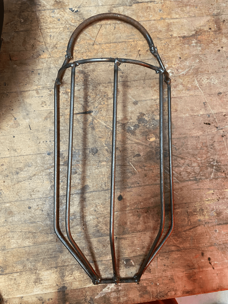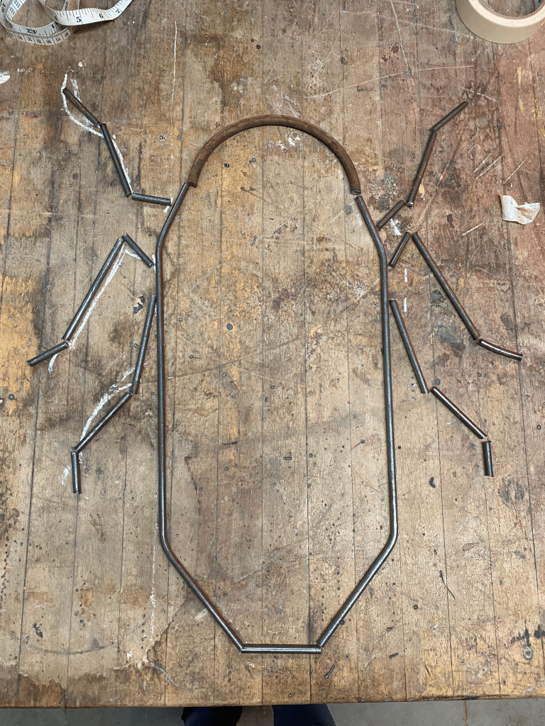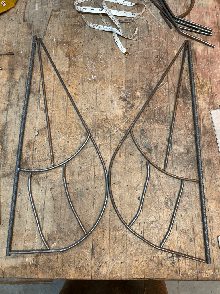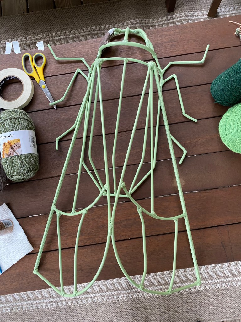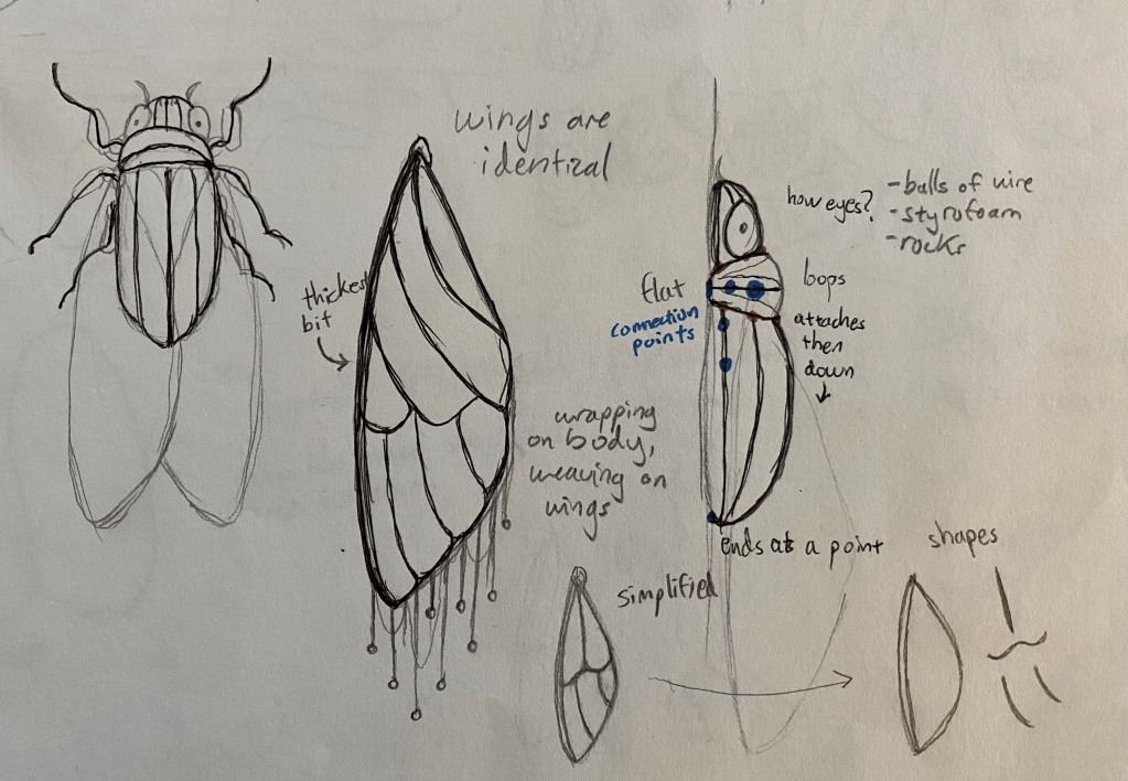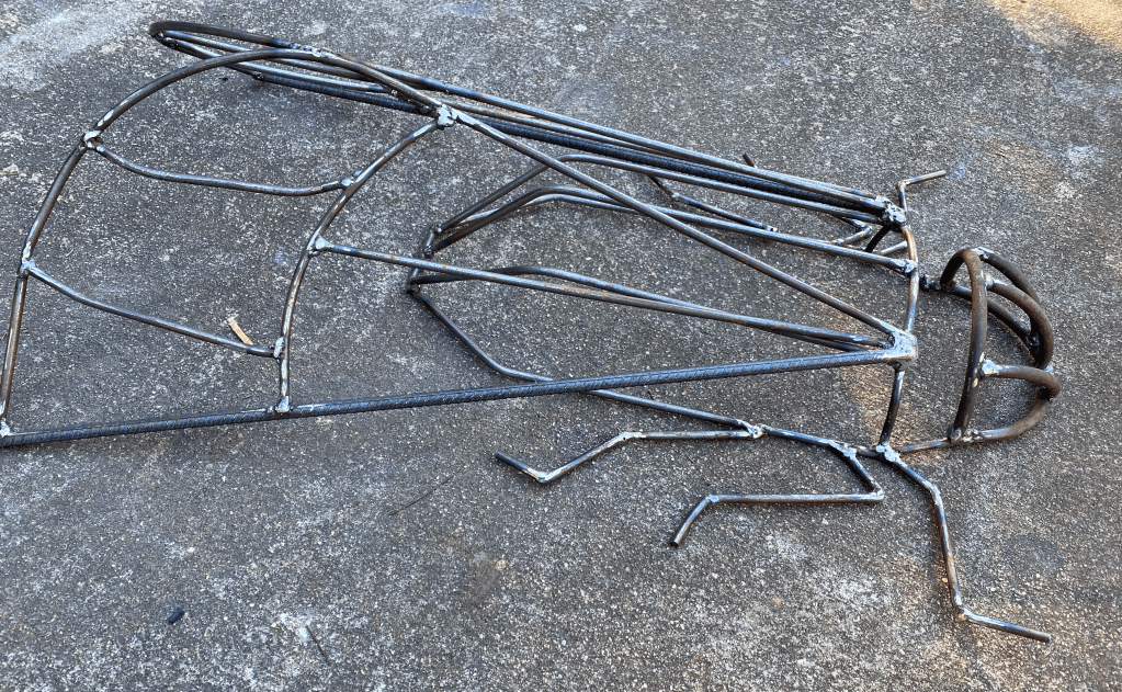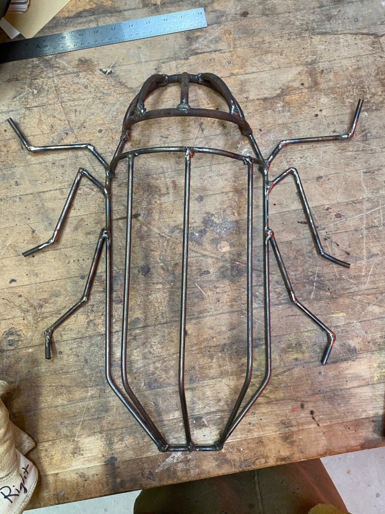 As always, I started with a sketch. Most of my sketches end up being more ambitious than what I can actually do, but that’s okayBoth wings before they were welded together. The thicker pieces of rebar make the outside edges of the wings, with the interior divisions being smaller gauge rebarThis is the majority of the body, before I added pieces to make it 3D. I like showing these images so that you can see the before and after of welding pieces togetherOne of the two wings, now welded together with a MIG welderAll six legs welded together and labeled for easy identification (there were a lot of bits to keep track of)The body receives the four pieces of rebar that make up its 3D form. Every piece of rebar was cut with an angle grinder. Some, like the body and rounded parts of the wings, were bent by hand. The head is made of pieces of a large steel coil, so I didn’t need to add the curve myself (thankfully)!Now, all of the body has been welded together. The head, like the body, has four pieces of rebar to make it 3D. In total, the body has 30 pieces of rebarWith the wings added, the rebar “skeleton” of the cicada is complete. Each wing has 6 pieces, which brings the total to 42 pieces of rebarHere it is from another angleYou can see the joins between each piece of rebar here. I did my best with an angle grinder to smooth out most of them, but the larger joins (like where the wings connect to the body) were too difficult to flatten completelyFinally, I spray-painted the body a light green. This was the end of the metalworking part of the project