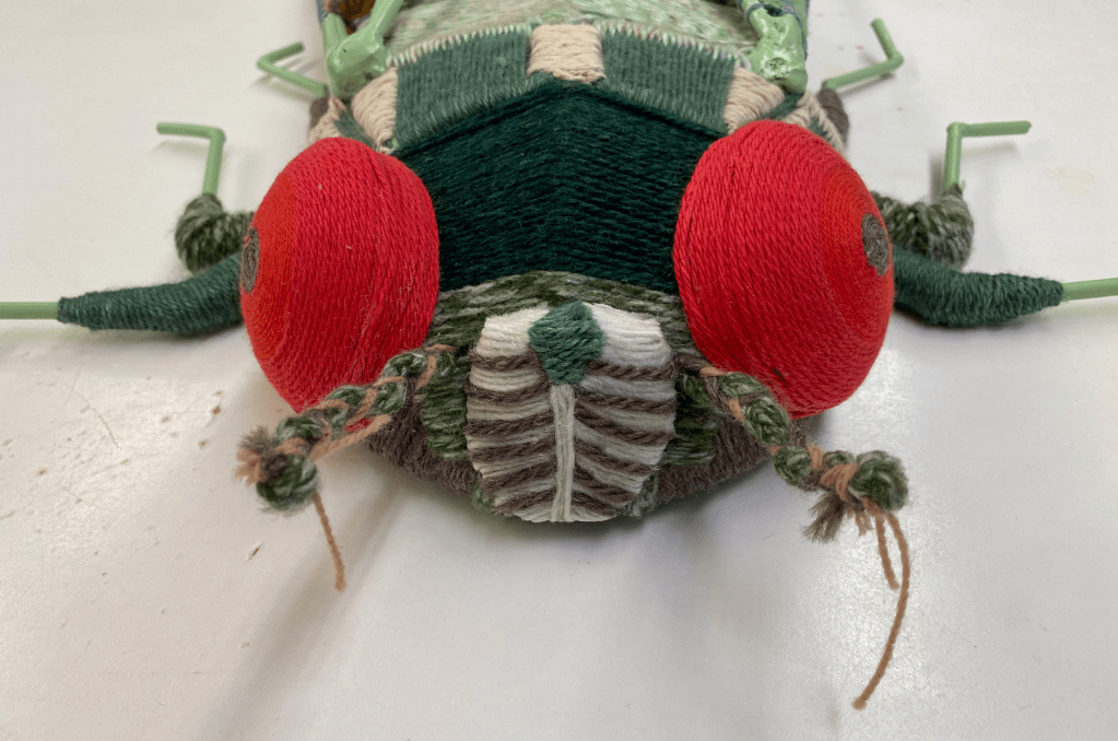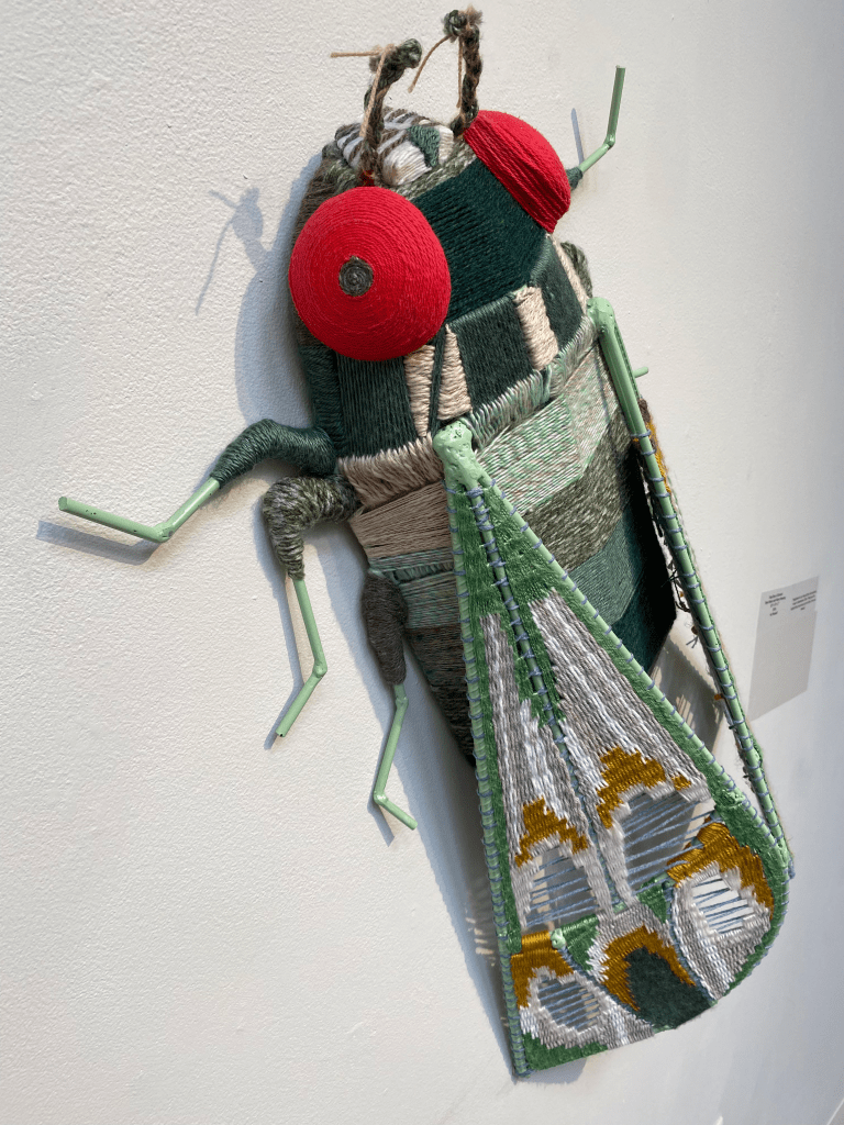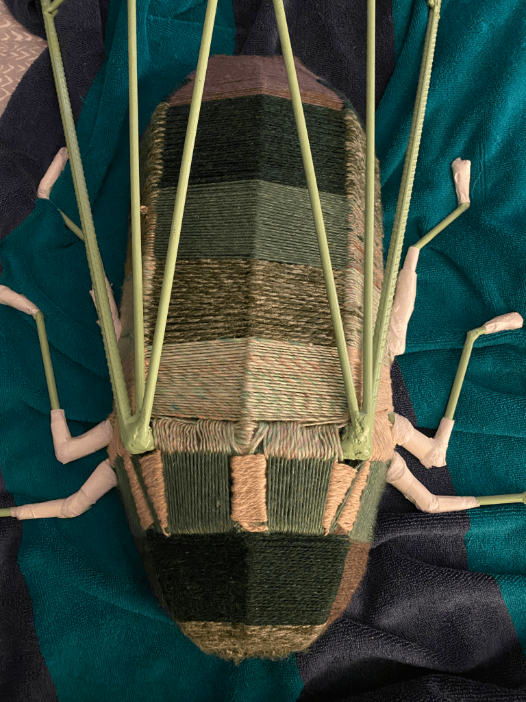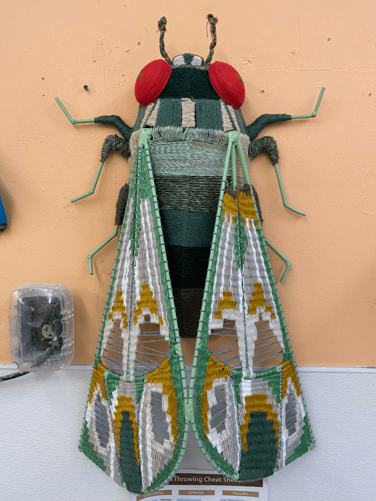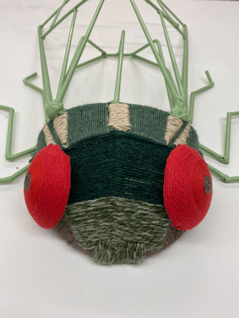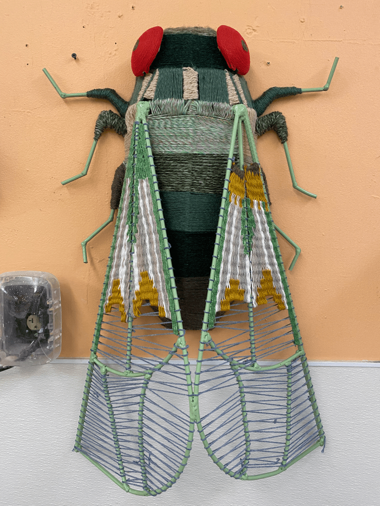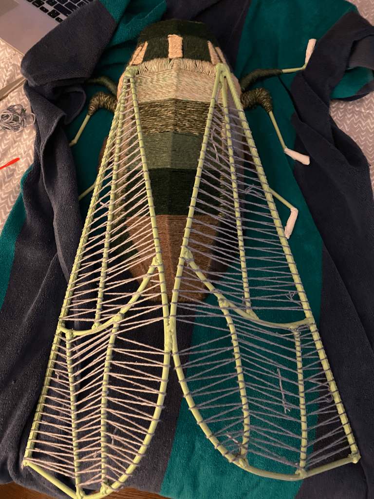 The creation process of the cicada’s famous eyes. I cut apart a styrofoam ball and wrapped it in yarnThe head of the cicada begins to take shape. Also, I lied a bit. The body is not woven, but rather each panel is wrapped with the desired yarn colorThe rest of the body is wrapped. I used paper towels to add bulk to the legs (and to create “boots” so the ends of the rebar wouldn’t cut me). And yes, I worked on my bed as it was the most comfortable for meAdding the warp to each wing panel probably took the longest. I had to pull each string taunt, add some glue to the frame, and hold it until the glue dried. Many times the warp slipped and I had to restart. This process was incredibly frustrating but was worthwhile in the endThe wings have half of the weaving complete. On the right wing, I was unable to add warp all the way up the wing like I had on the left. So I chose to add some asymmetry to the design to emphasize it rather than hide itAnd, at last, the other half is doneThe cicada is complete! It hung proudly at my senior exhibition in 2025A close-up on the face. I wanted to capture the unique features: the large eyes, the two short antennae, and the mouth part (a clypeus) that I lovingly refer to as a “car grille”. I love how my guy turned out!